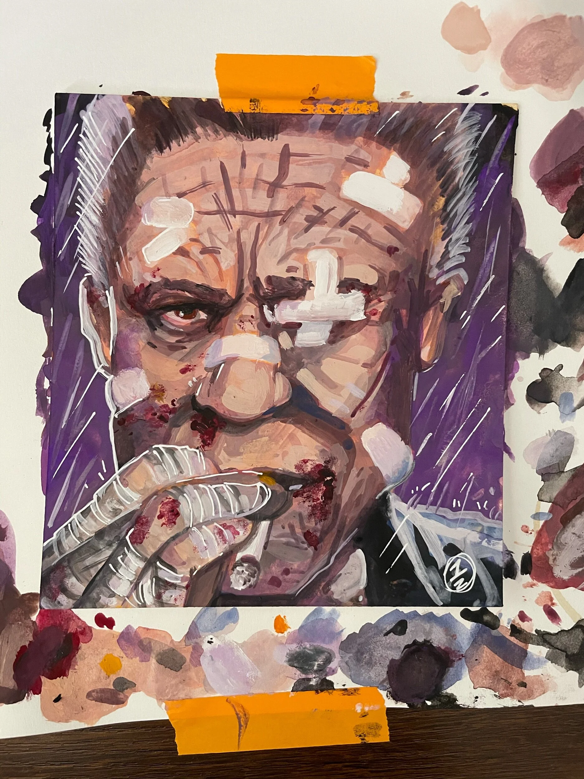 I took the opportunity to draw this based on grittiness and bandages. I definitely have a thing for bandages at this moment and I’m going to run with it for most of these portraits. Anyway, sketching this out was difficult as used a Pinterest reference that included direct lighting on bright skin and I had to take into account the hand proportions. I love challenging myself when I draw so I felt I did well with the sketch.